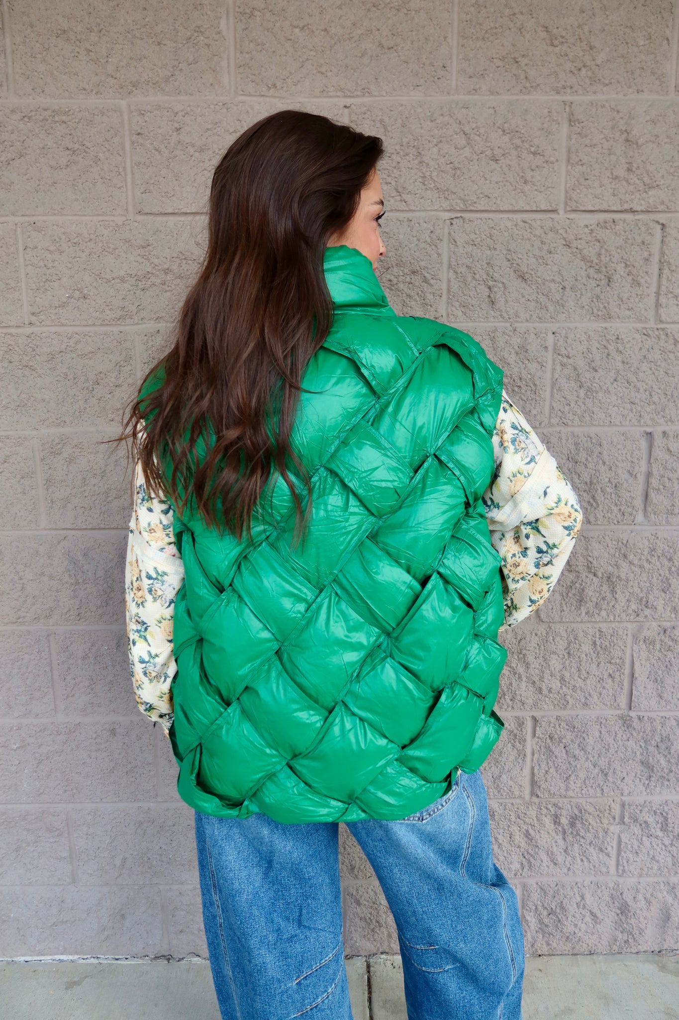 Everyone needs a puffer vest and this is calling your name! We have never seen more of a statement piece than this. The electric green mixed with the button up detail is absolute perfection.